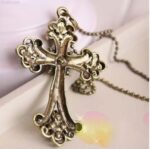 A luxurious vintage-inspired cross pendant necklace featuring an antique gold tone and intricate decorative patterns for an elegant, classic look.