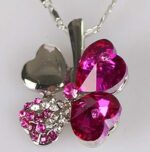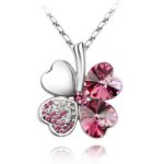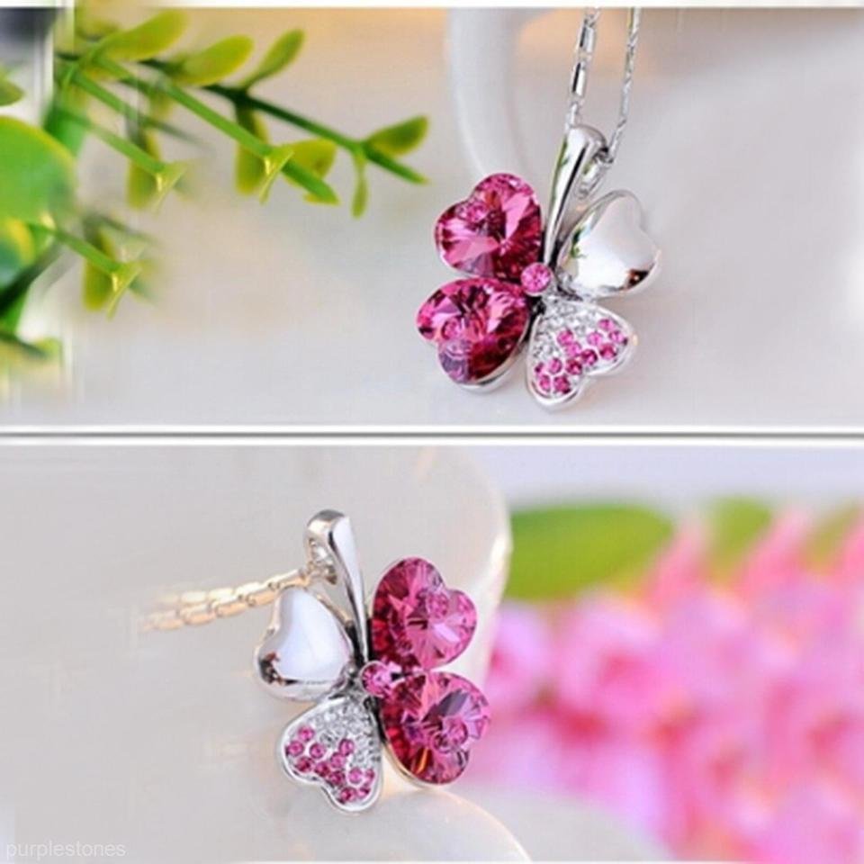 Pink Silver Four-Leaf Clover Necklace / Silver Crystal Line Stone