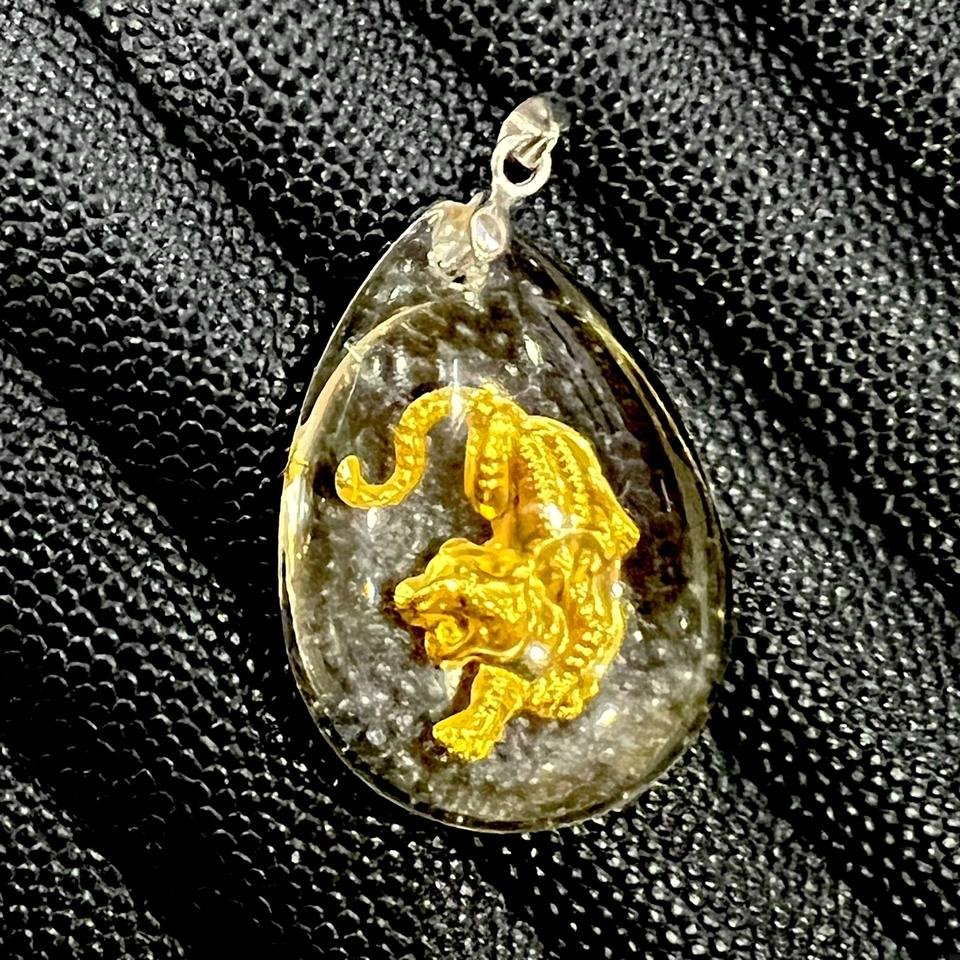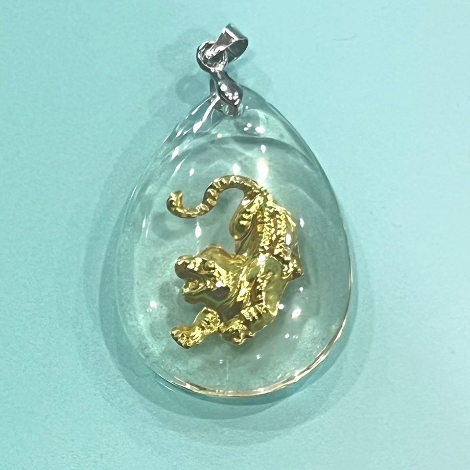 금으로 만든 포효하는 호랑이가 들어있는 목걸이입니다.